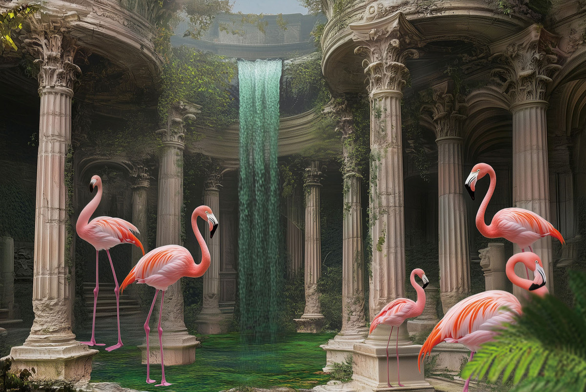 Glasschilderij 120x80cm Flamingo's in ruïne