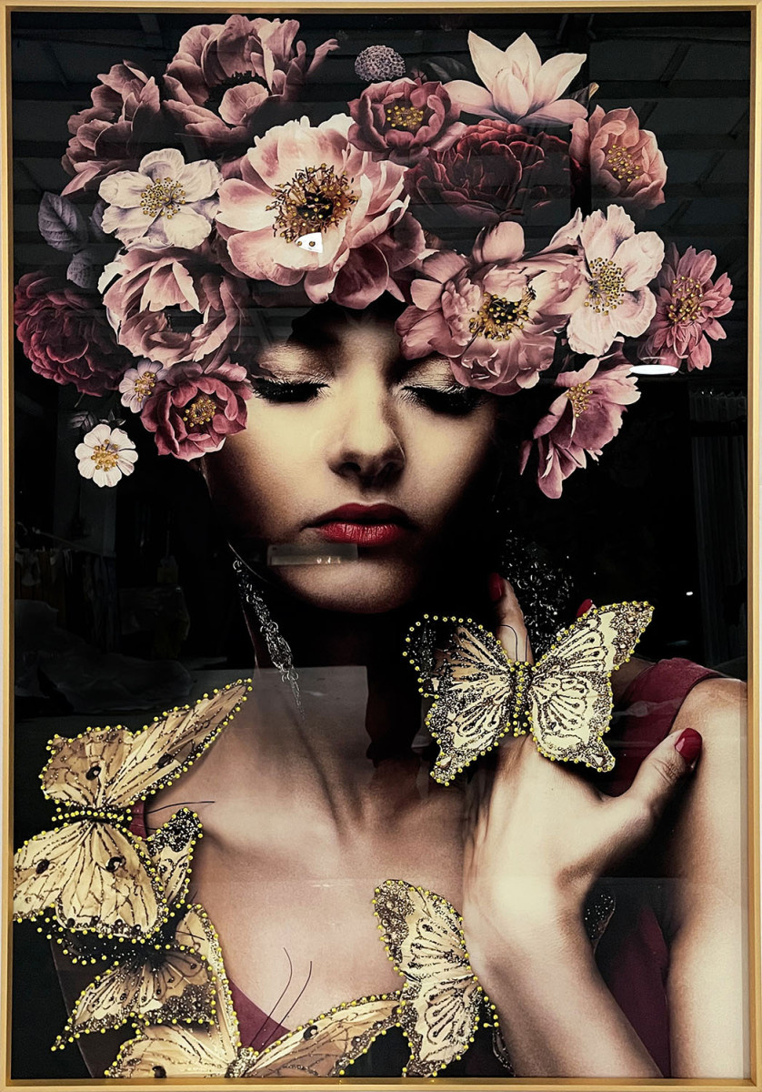 Glasschilderij met kristallen en lijst 80x120cm Vrouw met vlinderkrans