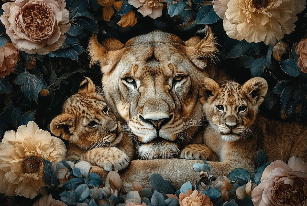 Glasschilderij 120x80cm Tijgers tussen de bloemen